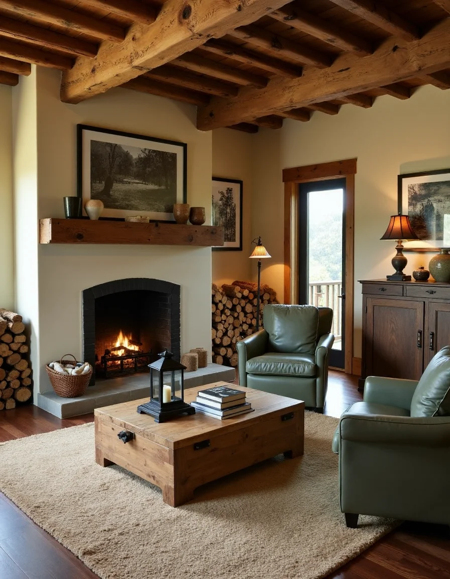The living room is a cozy retreat adorned with rustic charm, featuring exposed wooden beams on the ceiling and a stack of massive, weathered logs in one corner, serving both as decoration and a natural woodpile. A large, plush, earth-tone area rug is laid out on the hardwood floor, surrounded by a pair of muted green leather armchairs flanking a reclaimed wooden coffee table adorned with a collection of vintage books and a small iron lantern. The walls are painted a soft beige, with framed black-and-white photographs of nature scenes, and the warm lighting includes a wrought-iron floor lamp casting a gentle glow. A woven basket filled with soft blankets rests near the fireplace, where a crackling fire adds to the inviting atmosphere, complemented by a wooden cabinet showcasing hand-crafted pottery that reflects the raw beauty of nature.