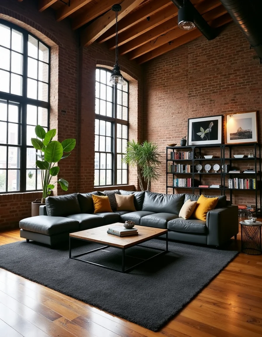 The living room features a striking industrial style, characterized by its open space and soaring ceiling windows that flood the area with natural light. The flooring is a rich, reclaimed wood that adds warmth to the room, contrasting beautifully with the exposed brick wall adorned with black iron shelves displaying a curated collection of books and art pieces. A large, charcoal-gray sectional leather sofa, with scattered mustard-colored throw pillows, sits in the center, inviting comfort while maintaining a sleek aesthetic. An oversized coffee table made from reclaimed wood and steel rests on a textured, dark gray area rug, surrounded by a few minimalist metal side tables and vintage wire stools. In one corner, a tall potted fiddle leaf fig plant and abstract artwork accentuate the industrial look, enhancing the room's overall loft-like atmosphere.