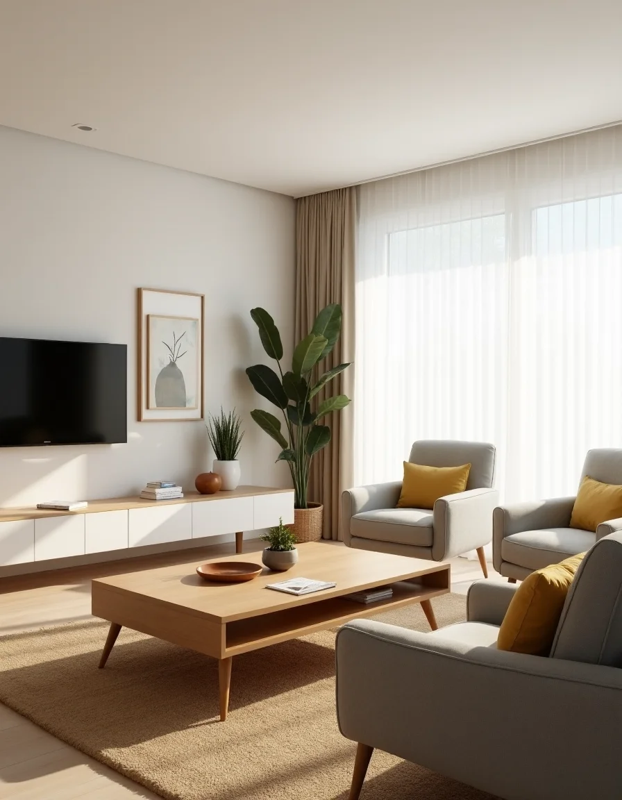 The living room features a spacious, airy ambiance with a minimalist Scandinavian design. A large light oak wood coffee table sits at the center, surrounded by a trio of plush, neutrally upholstered armchairs in soft grey, each accented by pale yellow throw pillows. Against one wall, a sleek white media console holds a slim flat-screen TV, decorated with small potted plants and an abstract art print in muted pastels above. The walls are painted in a warm off-white, enhancing the natural light that floods the room through sheer cotton curtains, while a cozy woven jute rug adds texture beneath the coffee table, completing the inviting and practical feel of the space.