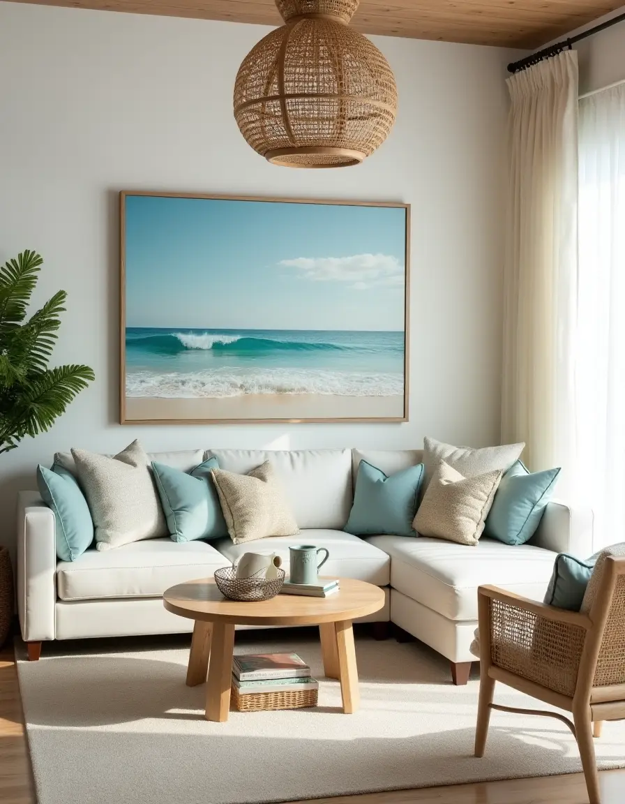 The living room exudes a seaside charm with its casual decor and soothing palette of soft blues and whites. A spacious white sectional couch, adorned with an assortment of plush, patterned throw pillows in sandy beige and oceanic teal, anchors the room. Light, weathered wood accents, including a coffee table with a driftwood finish positioned centrally in front of the couch, complement the airy atmosphere. Above the couch, a large canvas painting of a serene beach scene with gentle waves adds a focal point, while a wicker armchair nestled beside a tall potted palm gives a touch of coastal greenery. The room is softly illuminated by a large, woven rattan chandelier and framed by sheer, billowing curtains that flutter gracefully in the sea breeze, enhancing the relaxed and inviting ambiance.