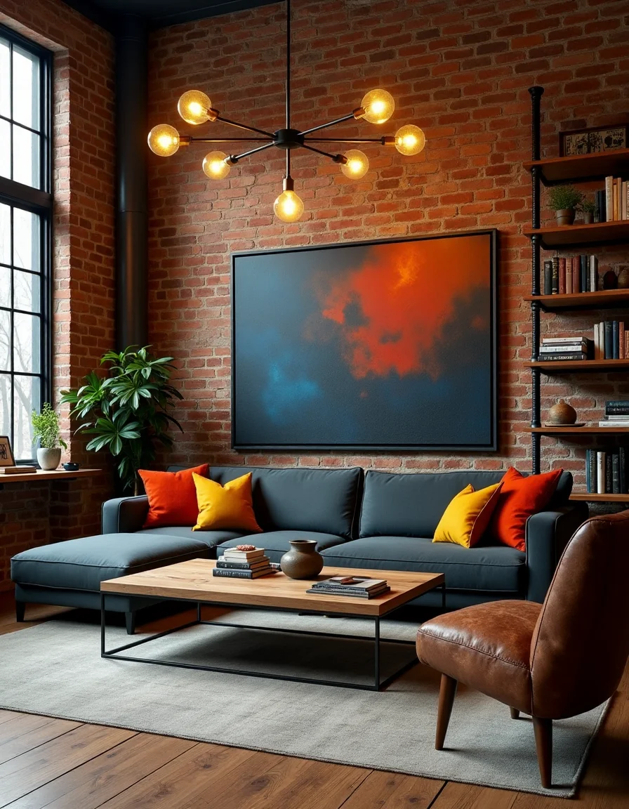 The living room embodies an industrial style, featuring a warm yet rugged ambiance. The main wall is exposed burnt-brick, providing an earthy backdrop that works beautifully with the open shelving made of black iron pipes, which display an eclectic mix of books and vintage decor. A large, reclaimed wood coffee table sits at the center, paired with a sectional couch upholstered in dark gray fabric, accented by brick red and mustard-colored throw pillows for a pop of color. Overhead, Edison bulbs illuminate the space, hanging from a raw metal chandelier with multiple arms, while a large abstract painting in deep blues and fiery oranges brings a contemporary touch to the atmosphere. The wood flooring is complemented by a distressed leather armchair that adds comfort and a touch of sophistication to this raw space.