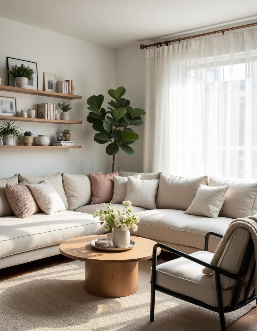 The Scandinavian living room is a serene oasis, characterized by its soft, muted color palette of whites, greys, and pastels. A large, light beige sectional sofa with plush, textured cushions sits prominently in the center, surrounded by fluffy white and pastel-colored throw pillows that add warmth. A round, natural pine coffee table with subtle imperfections embodies the essence of natural materials, complemented by a cozy handwoven area rug in light grey that anchors the seating arrangement. Along the walls, minimalist wooden shelves filled with potted green plants and curated art pieces contribute to the room's inviting atmosphere, while sheer white curtains lightly filter the sunlight, enhancing the calming ambiance. A pair of simple black and white armchairs flank the coffee table, creating a perfect corner for conversation, adorned with a knitted throw blanket draped carelessly over one arm.