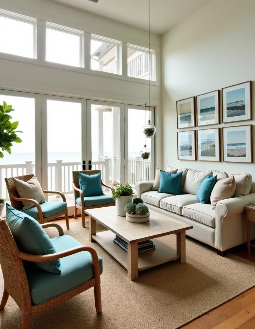 The living room embodies a serene seaside retreat with light, airy hues and ample natural light streaming through expansive floor-to-ceiling windows. Emphasizing wooden elements, the room features a distressed white oak coffee table at the center, complemented by a plush beige sectional sofa adorned with ocean-inspired throw pillows in turquoise and sandy beige. A pair of rattan chairs with soft blue cushions sit opposite the sofa, creating a cozy conversation nook, while a woven jute area rug ties the space together. Nautical decorations, such as driftwood sculptures and framed seascape prints, adorn the walls, evoking the tranquil essence of the beach, while indoor plants, like a tall snake plant and hanging terrariums, introduce earthy greens that enhance the room's natural flow.
