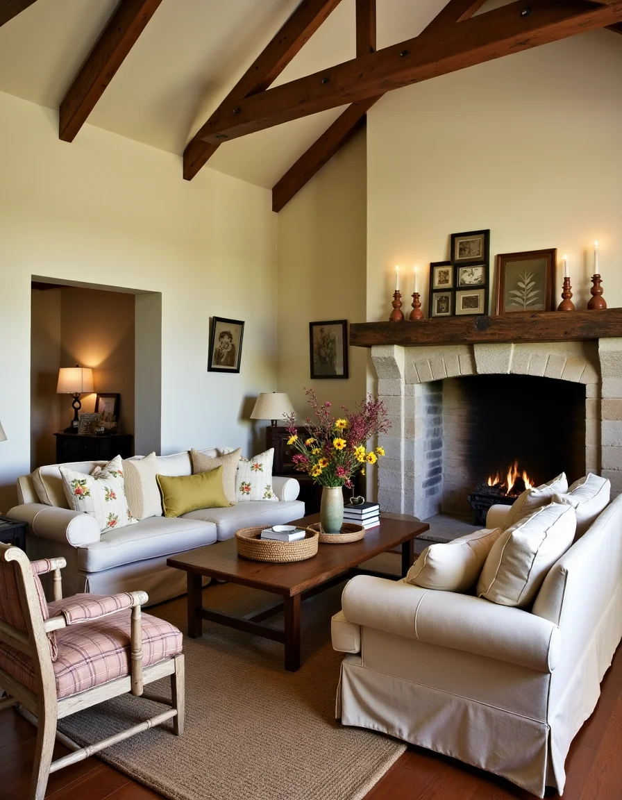 The living room embodies a warm country charm, with walls adorned in a rich cream color and rustic wooden beams accentuating the vaulted ceiling. A large, handcrafted oak dining table takes center stage, surrounded by mismatched antique chairs, each bearing a unique history. In one corner, an elegant stone fireplace stands proudly, its mantel adorned with weathered picture frames and a pair of flickering candles nestled in handcrafted pottery. Plush, overstuffed sofas with soft plaid and floral patterns invite relaxation, complemented by a braided jute area rug that adds texture underfoot. The room is finished off with vintage accessories, including a woven basket filled with throws and a collection of dried wildflowers in a rustic vase, creating an inviting and nostalgic ambiance.