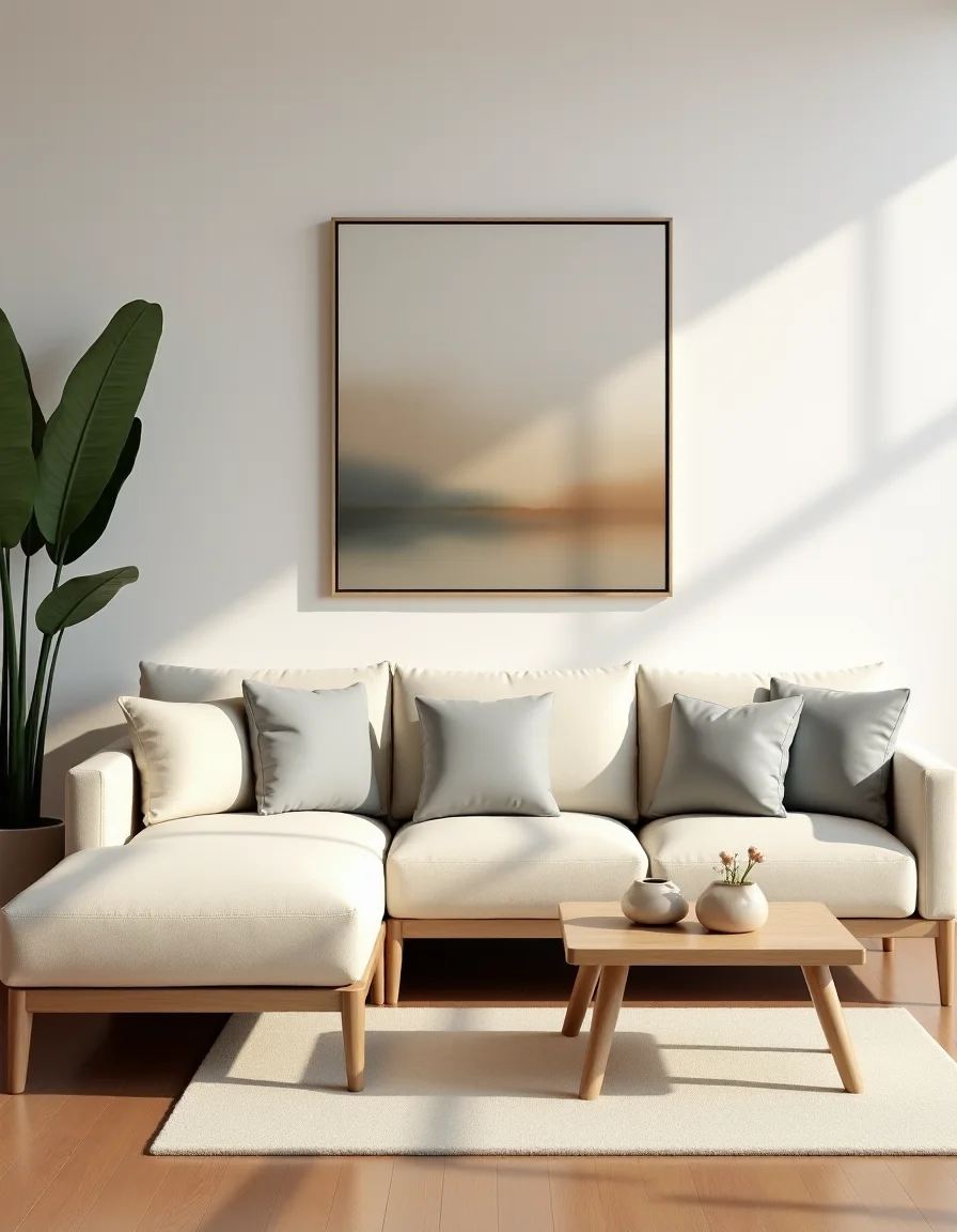 The living room embodies a minimalist design characterized by a serene and uncluttered ambiance. A plush cream-colored sectional sofa is placed at the center, adorned with a few strategically placed soft gray throw pillows, creating an inviting yet sleek focal point. A low-profile, square coffee table in natural oak sits adjacent, while a lightweight, beige area rug is layered beneath to add warmth and texture without overwhelming the space. The walls are painted in a calming soft white, accentuated by a single large piece of abstract art featuring muted earth tones above the sofa, while a tall potted snake plant adds a touch of greenery in one corner, contributing to the room's refreshing and durable appeal.