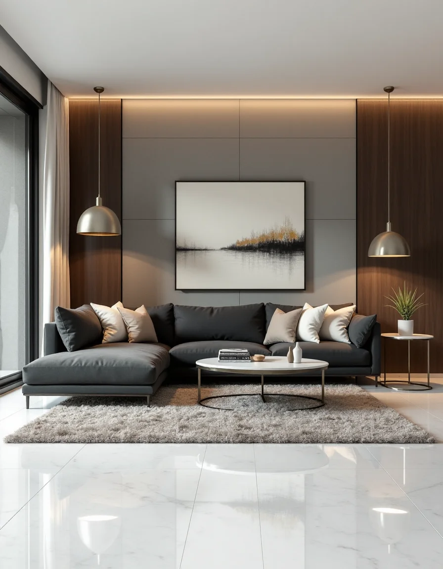 The living room is a stunning display of modern elegance, anchored by a striking polished white marble floor that reflects light beautifully. A sleek, low-profile charcoal-gray sectional sofa occupies the center of the space, adorned with scattered cushions in muted tones of cream and taupe for added texture. Behind the sofa, a minimalistic concrete accent wall serves as a backdrop for a large abstract painting with shades of black and gold, while a pair of contemporary steel-framed side tables hold minimalist decor pieces—one featuring a small potted succulent and the other a designer coffee table book. Soft, diffused lighting emanates from clean-lined pendant fixtures hanging above, casting a warm glow over the room, complemented by a simple shag rug in a soft dove gray, adding comfort underfoot without overpowering the sleek finishes of the space.