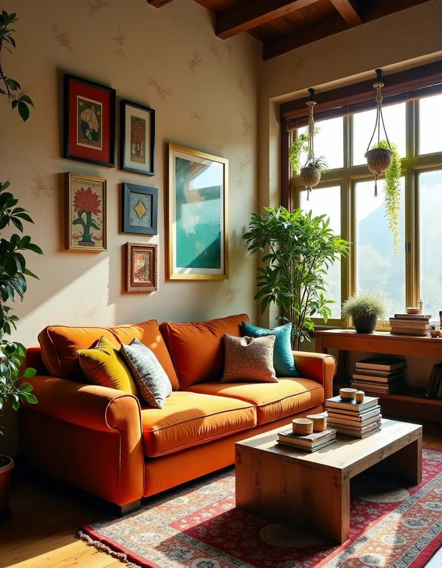 The living room exudes a cozy bohemian vibe, awash in vibrant colors and natural textures. A plush, oversized vintage sofa in burnt orange is centered against a backdrop of textured beige walls, adorned with eclectic wall art highlighting a mix of traditional crafts and abstract prints. A patterned area rug featuring shades of teal, mustard, and maroon anchors the seating area. Scattered cushions in varying sizes and rich prints add layers of comfort, while macrame hanging planters filled with trailing greenery dangle near large, sun-drenched windows, creating an inviting atmosphere. A reclaimed wooden coffee table stands in front of the sofa, adorned with an array of eclectic trinkets, candles, and a stack of well-loved books, augmenting the room’s charm with personal touches.