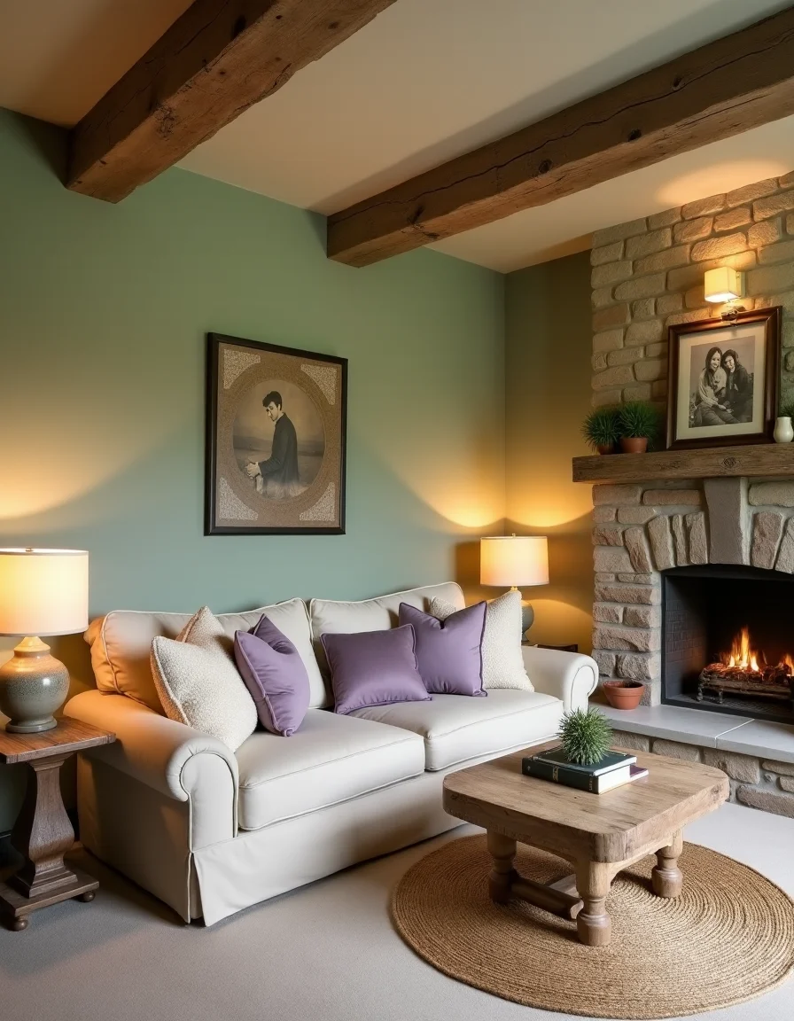 The living room is a cozy, inviting space characterized by muted pastels and earthy tones that blend seamlessly to create a warm ambiance. The walls are painted in a soft sage green, complemented by rustic wooden beams exposed overhead, adding a touch of classic country charm. A plush, beige oversized sofa is placed centrally, adorned with fluffy throw pillows in soft lavender and cream, anchoring the seating area. Flanking the sofa are two antique oak side tables, topped with vintage ceramic lamps that emit a soft glow, while a round jute rug lies underfoot to bring additional earthiness and texture to the room. To the side, a stone fireplace with a roaring fire creates a focal point, surrounded by carefully arranged decorative items, including assorted potted succulents and a weathered wood shelf displaying family photographs and handmade crafts.