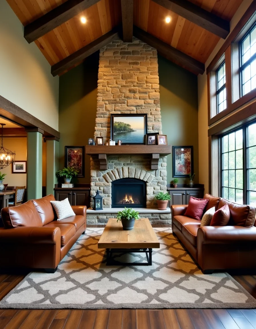 This cozy rustic living room features a high vaulted ceiling with exposed wooden beams that add a charmingly rugged character. A large stone fireplace serves as the room's focal point, adorned with a robust wooden mantle showcasing family photos in rustic frames and a few carefully placed potted succulents. Earthy tones dominate the space, with deep browns, rustic greens, and warm beige walls accentuated by a plush, patterned area rug in neutral tones. A pair of overstuffed leather sofas, positioned in an inviting U-shape around a rustic coffee table made of reclaimed wood, invite relaxation, while nature-inspired artwork adorns the walls, adding a touch of the outdoors inside.