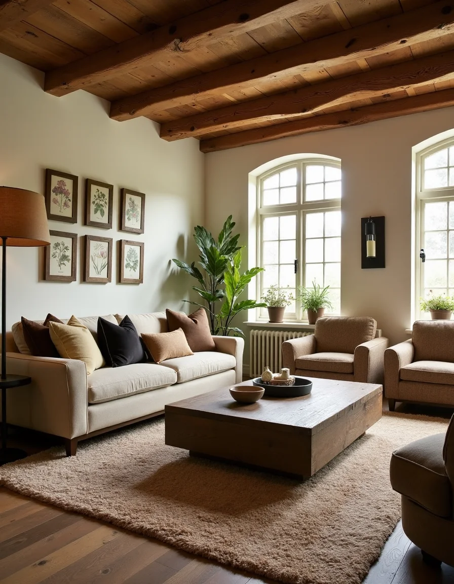 The living room exudes a warm and inviting rustic charm, featuring exposed wooden beams that stretch across the ceiling, giving a sense of spaciousness. A large, weathered oak coffee table occupies the center of the room, surrounded by mismatched but cozy woolen armchairs in earthy shades of brown and cream. A plush, handmade area rug in muted colors lies underneath, adding texture against the rich hardwood flooring. On one wall, a collection of vintage framed botanical prints adorned with reclaimed wood frames enhances the organic feel, while potted ferns and succulents grace the window sills, bringing a touch of nature indoors. Ambient lighting is provided by wrought iron sconces and a large floor lamp with a burlap shade, casting soft shadows that dance across the room, inviting relaxation and warmth.