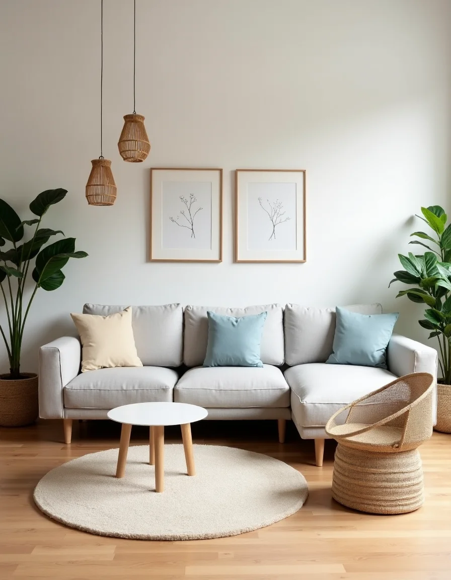 The living room emanates a serene and inviting Scandinavian aesthetic, featuring a light oak hardwood floor that complements the pale tones permeating the space. A cosy, light grey sectional sofa sits in the center, adorned with soft cream and pastel blue throw pillows that add a pop of color while maintaining a muted palette. Across from the sofa, a minimalist white coffee table with rounded edges is accompanied by a sleek rattan armchair that brings an organic touch. The walls are painted in a soft white hue, adorned with simple line art framed in natural wood, while potted green plants strategically placed in woven baskets breathe life into the room. Subtle touches such as a soft wool area rug in muted beige underfoot and lantern-style pendant lights hanging from the ceiling enhance the ambiance, creating a warm, airy retreat perfect for relaxation.