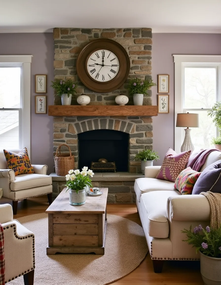 This cozy country living room exudes warmth and charm with its vintage, antique-inspired décor. The centerpiece is a rustic stone fireplace, featuring a wood mantle adorned with a collection of curated family heirlooms and woven baskets. The walls are painted in a soothing muted pastel hue—soft lavender—and decorated with framed botanical prints and a large farmhouse clock. A plush, overstuffed sofa in faded cream linen is draped with hand-knit throw blankets, paired with distressed wooden coffee tables and colorful patchwork cushions that invite relaxation. Finally, a braided jute rug grounds the space, while potted greenery and mason jar vases filled with dried flowers add a touch of nature.