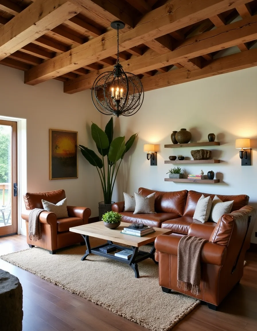 The living room exudes a warm rustic charm dominated by exposed wooden beams that stretch across the ceiling, offering a handmade authenticity. A large, weathered oak coffee table occupies the center, surrounded by a pair of plush, faded leather armchairs with deep seating for added comfort, accented with handwoven throw blankets in earth tones. Two handcrafted wooden shelves on the walls display an assortment of artisanal pottery and vintage books, while a series of potted succulents add a refreshing touch of greenery. The flooring is constructed from reclaimed barn wood, set off by a large, textured jute area rug in a neutral beige. Finally, a relaxed ambiance is created by the warm glow of a wrought iron chandelier hanging above, complemented by soft, fabric wall sconces that bathe the room in gentle light.
