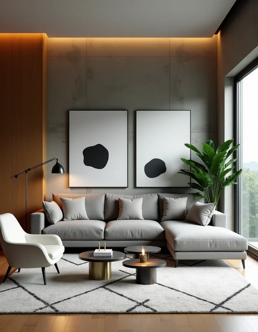 This modern living room boasts a striking combination of concrete walls and warm wooden accents. The focal point is a sleek, low-profile grey sectional sofa featuring clean lines, positioned at the center with a plush, geometric patterned area rug grounding the space. A contemporary glass coffee table with sharp angles sits atop the rug, complemented by brushed metal decor pieces. An industrial-style floor lamp with an exaggerated arm illuminates the corner, while large potted plants add a touch of green, softening the overall aesthetic. Wall art featuring abstract shapes in monochromatic colors enhances the minimalist vibe.