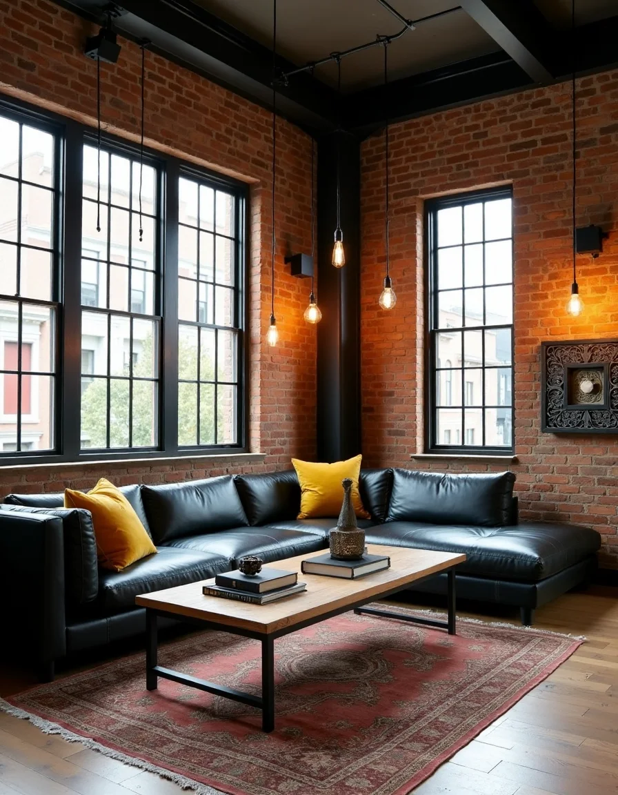 This striking industrial living room features an exposed brick wall that serves as a dramatic backdrop, complemented by large steel beams overhead. A sleek black leather sectional sofa is positioned at an angle to create a cozy seating area, adorned with plush mustard-yellow throw pillows that add a pop of color. A reclaimed wood coffee table with metal legs occupies the center, showcasing a collection of industrial-style books and a cast iron sculpture. Large windows framed with raw black steel allow ample natural light to flood the space, which is further enhanced by hanging Edison bulb light fixtures that dangle from metal chains and contribute to the urban atmosphere. To complete the look, a vintage-style rug with geometric patterns sits underfoot, grounding the eclectic mix of metals and textures throughout the room.