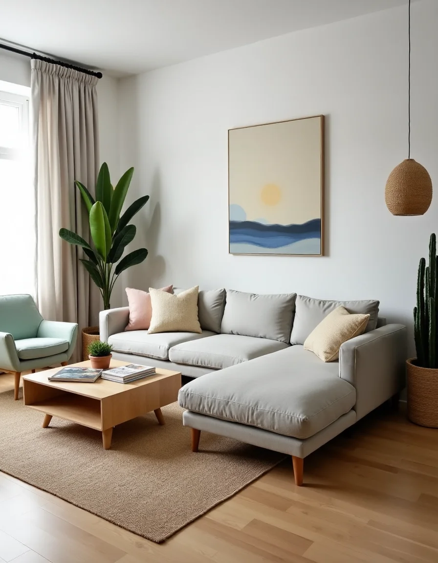 This Scandinavian-style living room embodies the essence of coziness and simplicity, featuring a large, plush light gray sectional sofa adorned with soft, cream and pastel throw pillows, positioned in the center of the room. A minimalist wooden coffee table, crafted from light oak, sits in front of the sofa, accompanied by a few carefully placed decorative elements such as a small potted succulent and a stack of art books showcasing Nordic design. The walls are painted in a soft white, allowing natural light to flood the space through sheer linen curtains that drape gracefully from modern black metal curtain rods. A woven jute area rug adds warmth to the light hardwood flooring, while a pair of vintage Scandinavian-style armchairs upholstered in a muted mint green sit invitingly in the corner, creating a perfect reading nook beneath a large abstract wall painting featuring subtle hues of blue and yellow. A tall, slender indoor plant in a natural woven basket breathes life into the corner, harmonizing with the natural materials that dominate the decor and immersing the room in an ambiance of tranquility and effortless elegance.