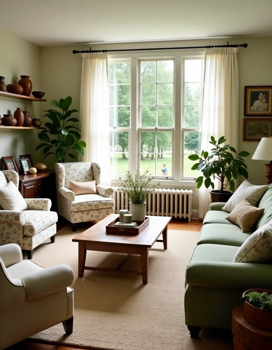 This cozy country-style living room exudes warmth and charm with its abundance of natural light streaming through large, paned windows draped with sheer, white linen curtains. The space features a handcrafted, weathered oak coffee table at the center, surrounded by a pair of plump, overstuffed armchairs upholstered in a soft, floral print fabric, echoing the countryside's blooms. A large, inviting sectional sofa, covered in a muted sage green fabric, invites relaxation while a handwoven wool rug in earth tones warms the rustic wooden floor beneath. The walls are adorned with artfully arranged vintage wooden shelves, displaying an eclectic mix of handcrafted pottery, family photos in rustic frames, and lush potted greenery that brings the outdoors inside.