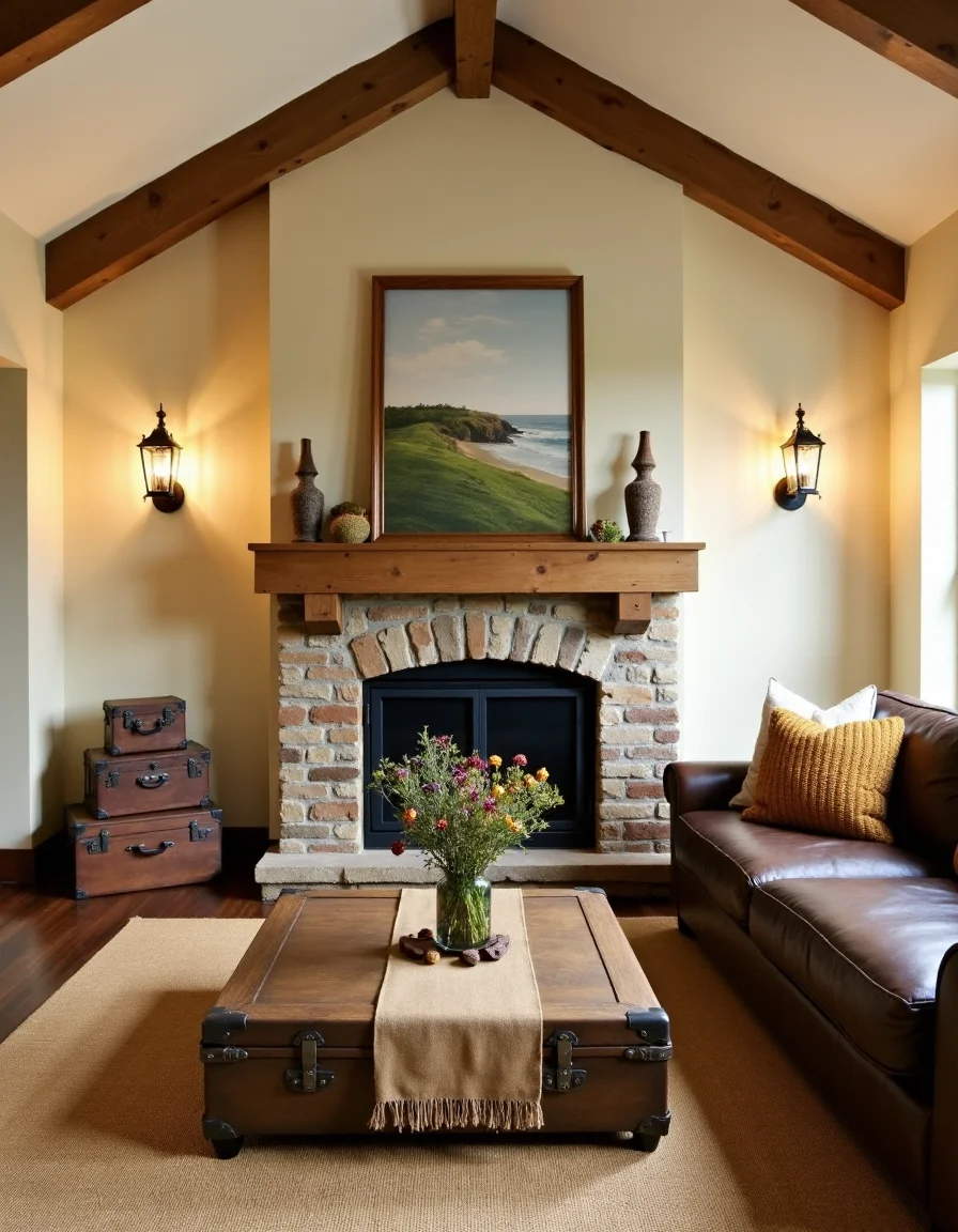 The living room embodies a warm rustic charm, with walls painted in soft beige and earth-tone wooden beams crisscrossing overhead. In the center, a large, distressed leather sofa in dark brown is adorned with a mix of oatmeal and terracotta throw pillows, inviting relaxation. A reclaimed wood coffee table sits atop a jute area rug, completed with a burlap runner displaying a vase of wildflowers. Flanking the fireplace, which boasts a sturdy stone façade, are two black wrought iron sconces, casting a gentle glow during cozy evenings, while vintage suitcases and wooden crates inspire a touch of adventurous nostalgia in the corners of the room.