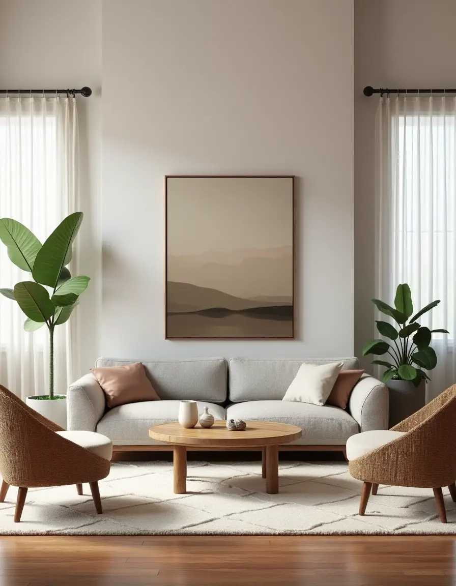 The living room features a harmonious blend of modern aesthetics with natural materials. A large, soft gray sectional sofa sits centered against a smooth, light-toned stone wall, adorned with a minimalistic framed abstract painting in muted earth tones. A sleek, low-profile coffee table made from reclaimed wood is placed in front of the sofa, surrounded by two stylish woven armchairs that add warmth and texture. To enhance the ambiance, two floor-to-ceiling windows draped in sheer white curtains allow natural light to flood in, highlighting the rich wooden floors. A cozy area rug with a simple geometric pattern anchors the space, while potted indoor plants positioned in the corners bring a touch of greenery, completing the serene and sophisticated atmosphere.