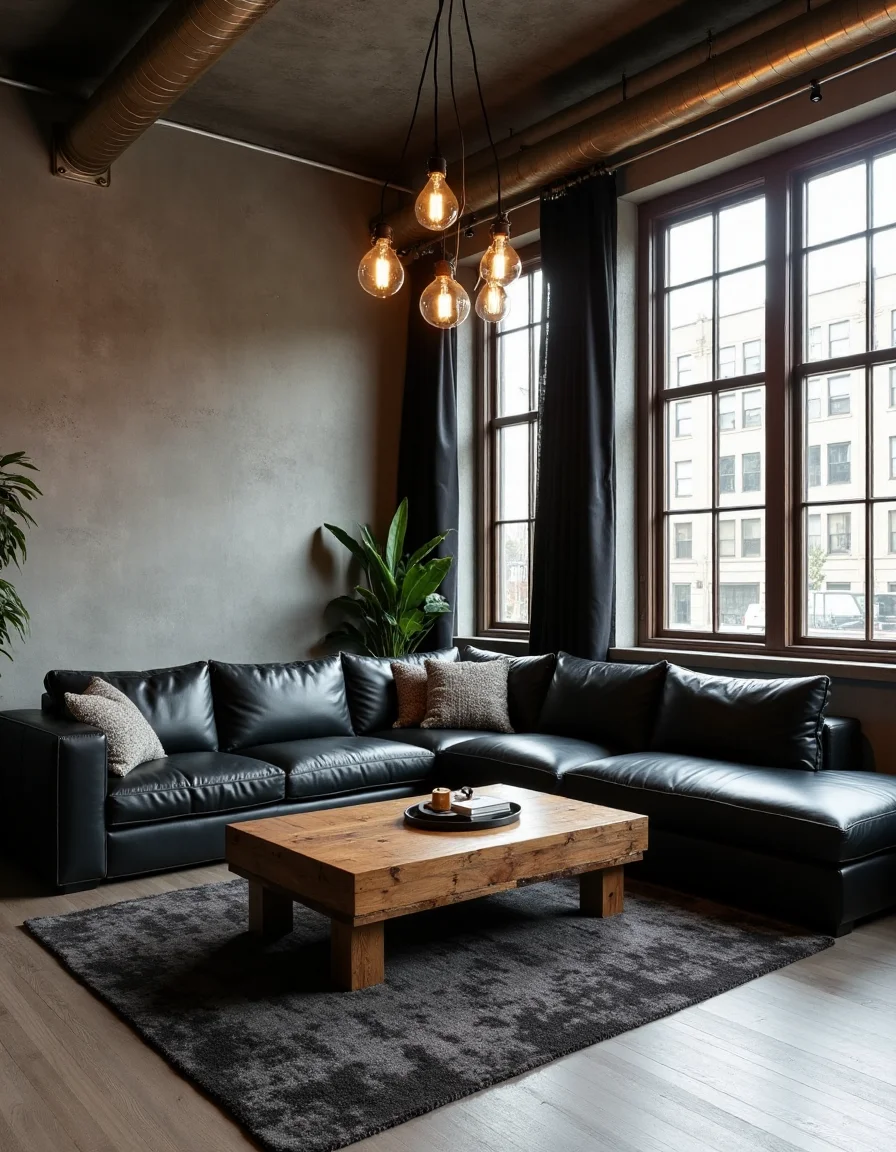 This industrial style living room boasts a solid reclaimed wooden coffee table placed centrally on a rich, textured area rug of deep charcoal grey. Adjacent to the table is a large, comfortable black leather sectional sofa, offering a warm contrast with its distressed finish against the concrete gray walls. Completing the aesthetic, exposed metal piping runs along the ceiling, while large factory-style windows allow in ample natural light, adorned with sheer black drapes that filter the sunlight beautifully. Overhead, a striking vintage pendant light with Edison bulbs hangs prominently above the seating area, further enhancing the urban vibe with its raw, industrial charm.