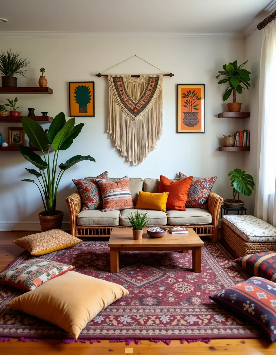 The living room exudes a warm bohemian charm filled with an eclectic mix of furniture and accessories. A low, vintage wooden coffee table sits at the center, surrounded by a collection of mismatched floor cushions in vibrant patterns—tribal prints, floral designs, and deep earthy tones. A plush, large woven area rug with intricate designs anchors the room, adding a cozy texture over the hardwood floor. Along the walls, floating wooden shelves hold an assortment of potted plants, books, and cherished trinkets from travels, while framed art pieces in bright colors and cultural motifs add personality and dimension. A macramé wall hanging serves as a statement piece above a two-seater rattan sofa, adorned with an array of colorful throw pillows that invite relaxation and spontaneity.