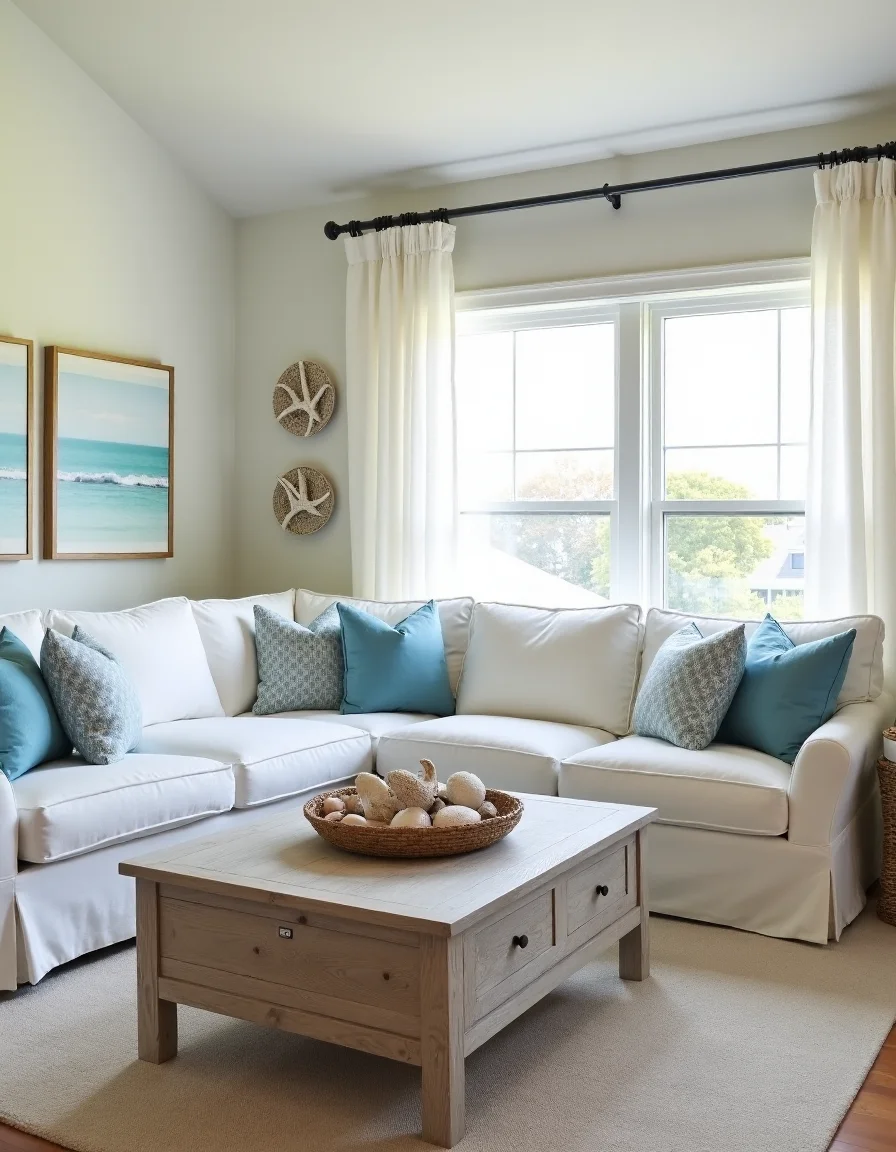 This seaside-inspired living room features a spacious layout drenched in soft, airy colors. The focal point is a large, white sectional couch adorned with soft blue throw pillows, positioned diagonally in the center of the room to create an inviting conversational area. A weathered, reclaimed wood coffee table with a light beach finish sits at its center, topped with a decorative bowl filled with seashells and driftwood accents. Light sheer curtains frame a big window, allowing sunlight to flood in and reflect off a pale sandy-colored rug beneath. Adorning the walls are serene coastal landscapes in whitewashed frames, complemented by wall art made of coral and starfish, enhancing the casual, laid-back coastal vibe of this beautiful living room.