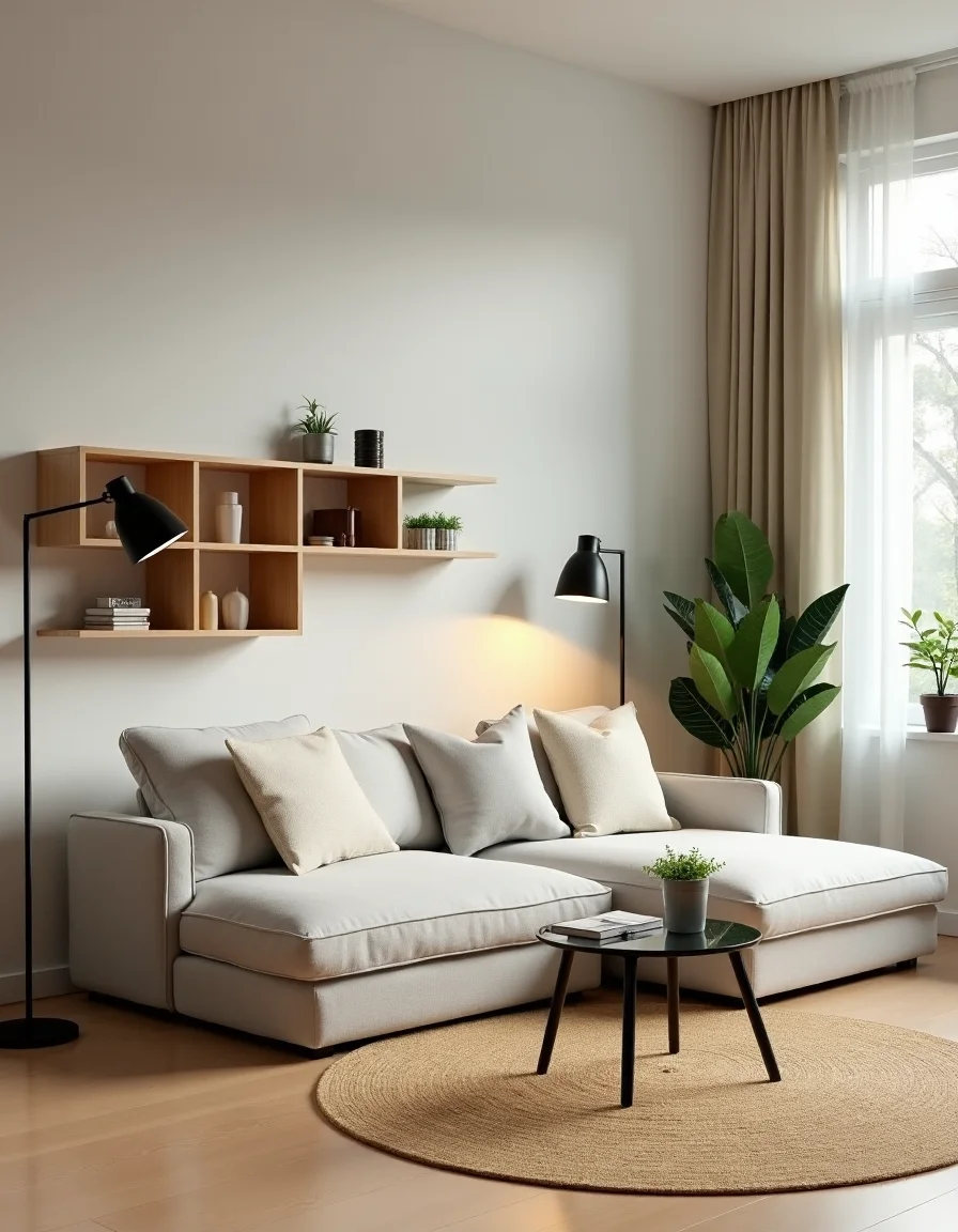 The living room exudes a serene minimalist vibe, featuring a low-profile, sectional sofa in light gray fabric, anchored in the center of the space. A sleek, round glass coffee table sits atop a warm, beige area rug, while modular wooden shelving in a soft oak finish graces one wall, offering both display and storage without overwhelming the space. To enhance the openness, a pair of black metal floor lamps with slender profiles flanks the sofa, casting warm, inviting light. Meanwhile, carefully curated potted plants add a touch of greenery, positioned strategically to maintain negative space and harmony within the room..