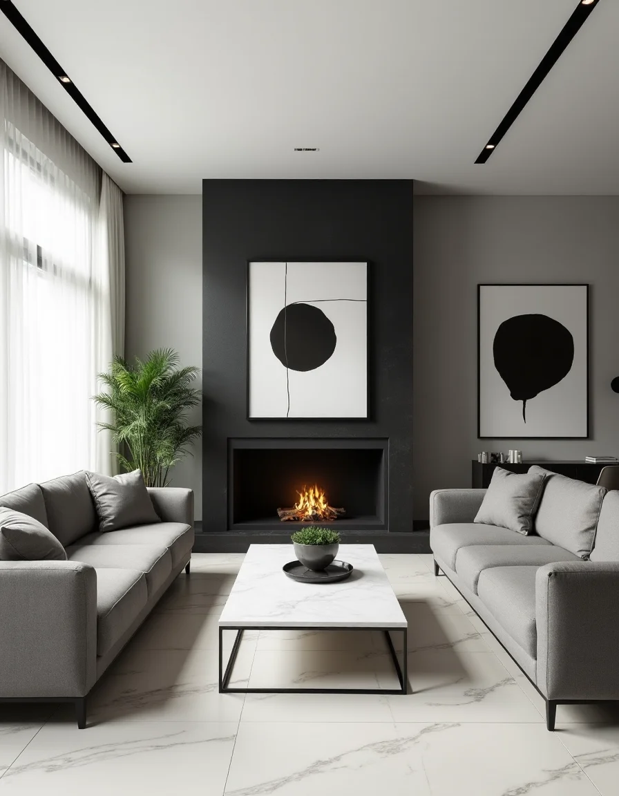 The modern living room is a sophisticated blend of elegance and simplicity, featuring a sleek white marble coffee table as the centerpiece, flanked by a pair of minimalist gray fabric sofas arranged in a stylish L-shape. The walls are painted in a soft dove gray, providing a calming backdrop for the bold black stone fireplace that exudes warmth and creates a natural focal point. Accentuating the space are large, abstract monochrome artworks hung elegantly above the sofas, paired with subtle potted greenery that brings life and freshness to the room. Large floor-to-ceiling windows offer ample natural light, enhancing the light marble flooring while sheer white curtains flutter softly, adding an airy feel to the modern aesthetic.
