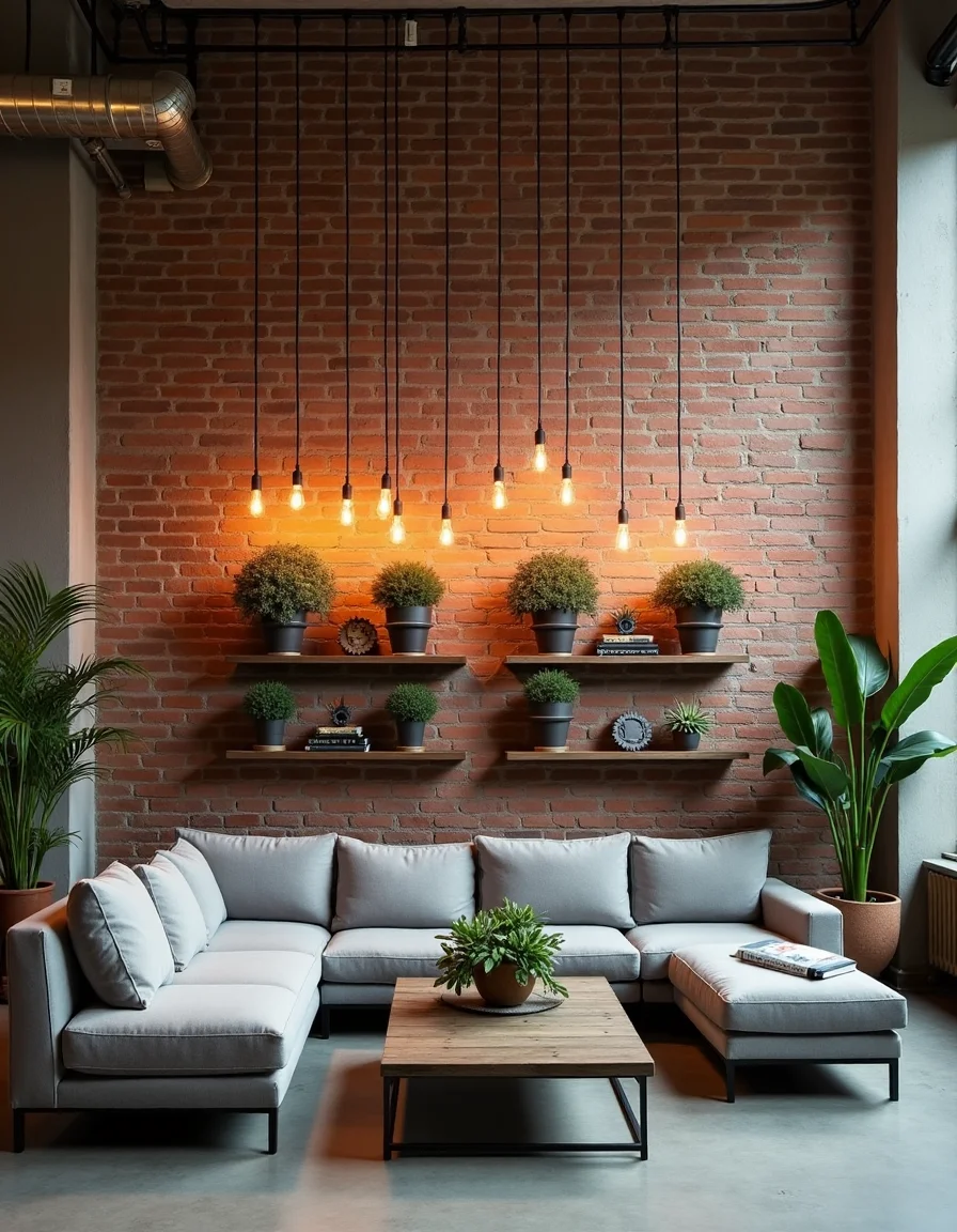 This industrial-style living room features a striking exposed brick wall that serves as a backdrop for the entire space, complemented by large, reinforced concrete pillars strategically placed for an open feel. Centered in the room is a wide, grey sectional sofa upholstered in a soft fabric, positioned on a distressed wooden coffee table with metal accents. Overhead, a series of Edison bulb pendant lights hang from raw metal pipes, casting a warm, inviting glow across the room while vintage, iron-framed armchairs add an extra layer of comfort. Alongside the walls, floating wooden shelves display an array of succulents and industrial-themed decor, such as metal gears and vintage books, combining rustic charm with contemporary edge.