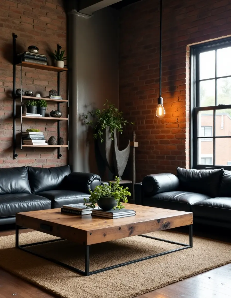 The living room embodies a striking industrial style, characterized by its use of raw materials and a color palette of deep grays and warm browns. An oversized solid wooden coffee table with a distressed finish anchors the room at its center, surrounded by a set of black leather sofas that feature a sleek, minimalist design. Iron shelves, fixed to exposed brick walls, display an eclectic collection of vintage books and potted succulents, while a large, abstract metal sculpture leans against one corner. In the opposite corner, a steel-framed floor lamp with an Edison bulb casts a warm glow, complemented by a rustic, woven jute rug underfoot that adds texture to the space.