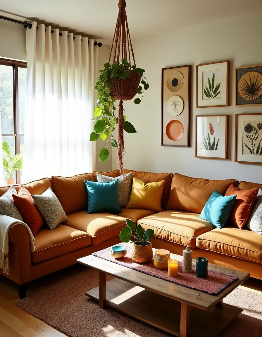 The living room emanates a cheerful bohemian vibe, filled with natural light streaming through sheer white curtains that billow softly in the breeze. A cozy, oversized earth-toned sectional sofa lines one wall, adorned with an assortment of vibrant, patterned throw pillows in hues of terracotta, teal, and mustard yellow. A large, hanging macramé plant holder dangles from the ceiling, featuring cascading greenery that adds life to the space, while a pair of potted fiddle leaf figs sit in ceramic pots boasting intricate designs on each side. A reclaimed wood coffee table rests at the center, topped with a colorful woven table runner, artisanal coasters, and an eclectic assortment of candles in various shapes and heights, providing an inviting focal point for gatherings. The walls are adorned with an array of framed botanical prints and woven textile art, further enhancing the natural, free-spirited aura of the room.