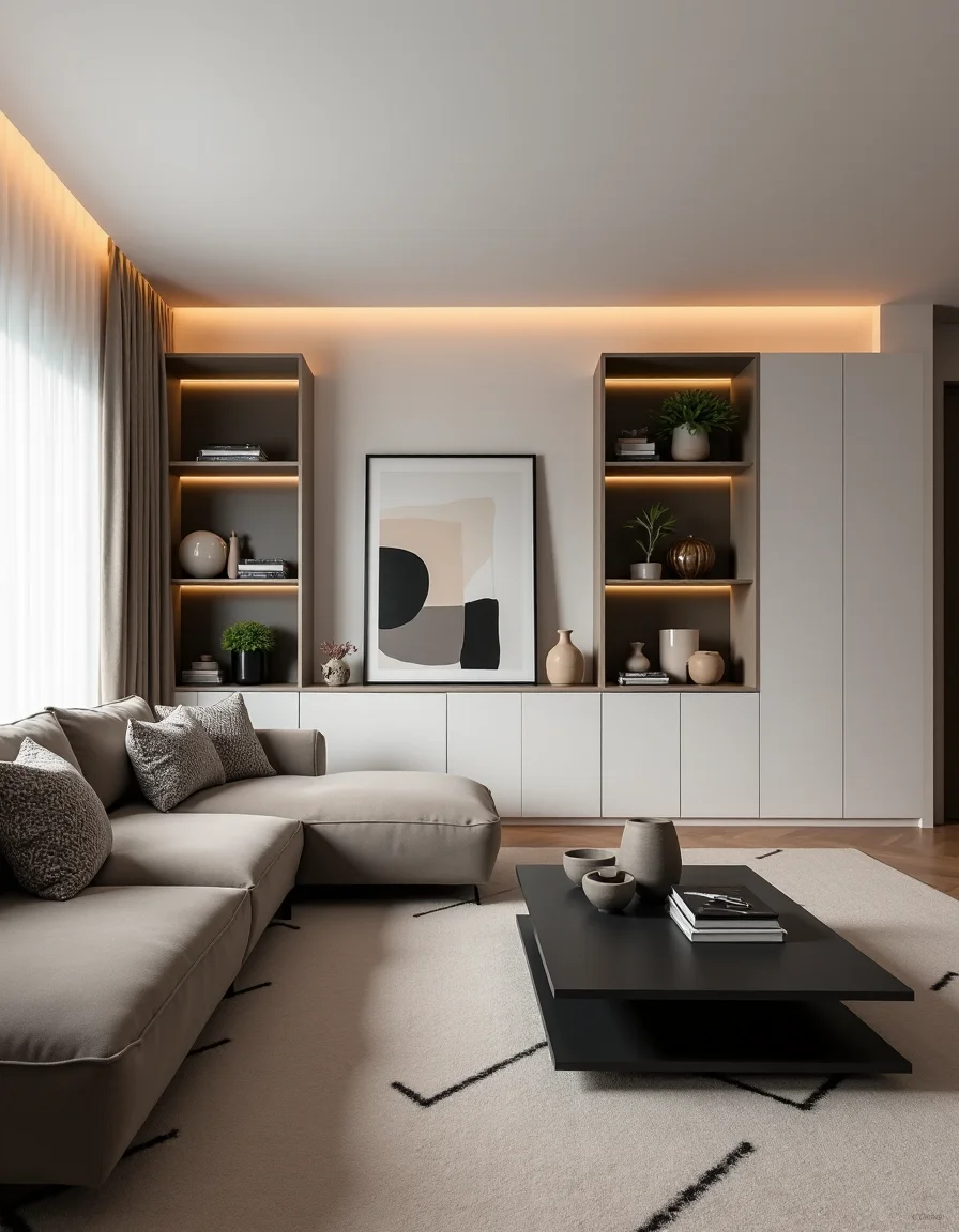 The living room exudes a sleek modern ambiance with a color palette of muted grays, crisp whites, and soft taupes. At the center, a low-profile sectional sofa upholstered in a luxurious matte fabric sits against the wall, adorned with geometric-patterned throw pillows in shades of charcoal and ivory. Directly opposite, an elongated, minimalist coffee table with a matte black finish rests on a plush area rug featuring a subdued diagonal stripe design. Streamlined shelving units, painted in pristine white, line one side of the room, housing a curated collection of potted succulents, art books, and decorative sculptural pieces in polished metal. Soft LED strip lighting accentuates the clean lines of the space, with a few strategically placed framed abstract art pieces adding a pop of color to the otherwise neutral environment.