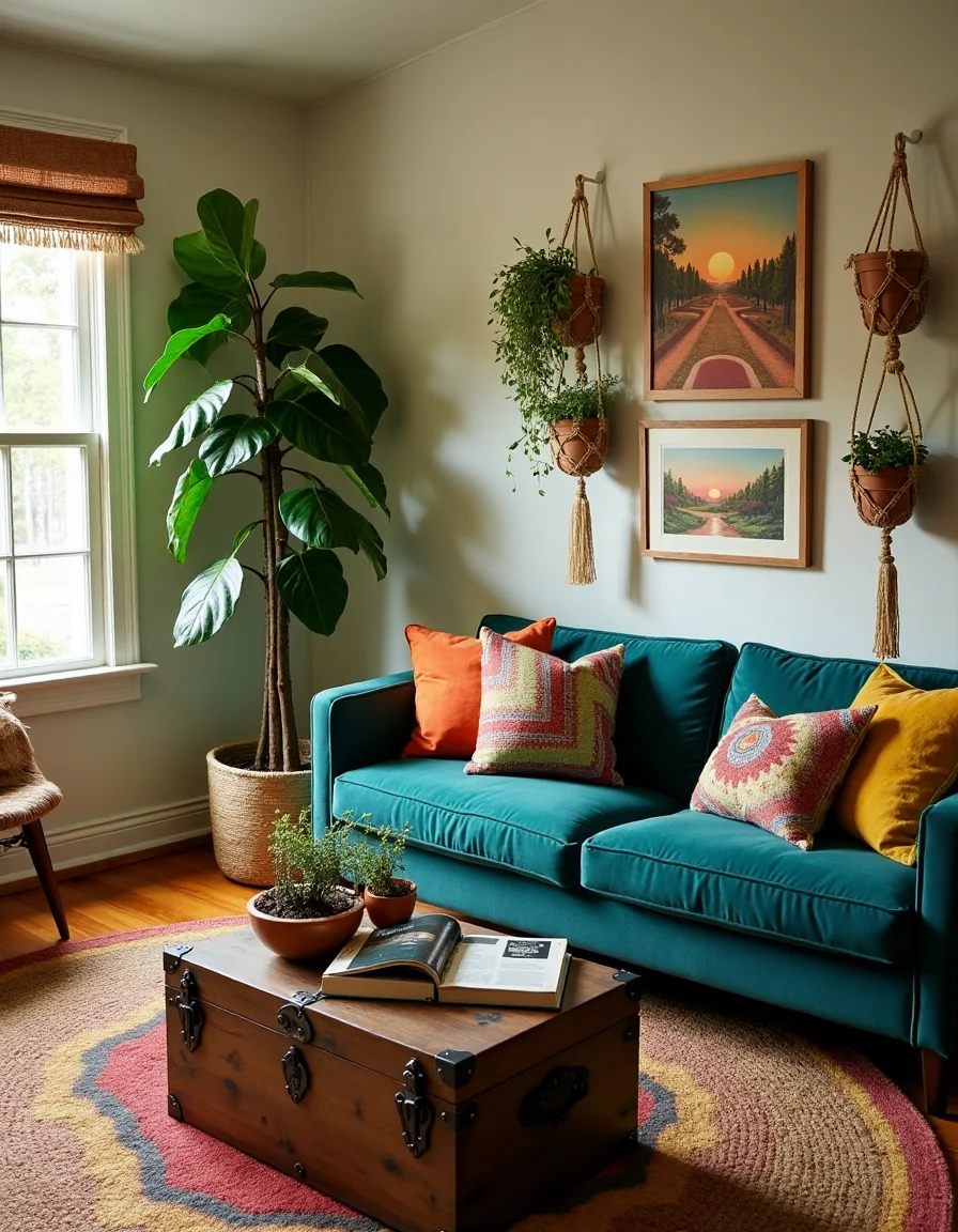 The living room radiates a warm bohemian vibe, infused with eclectic touches and vibrant colors. A deep teal sofa with faded, colorful throw pillows sits center stage, encircled by a round, patterned jute rug that adds texture underfoot. In one corner, a tall fiddle leaf fig tree reaches toward the ceiling, while various potted succulents in mismatched ceramic pots spill across the colorful side table made of reclaimed wood. The walls are adorned with framed art that features tribal patterns and landscapes, mixed with hanging macramé planters, casting playful shadows in the gentle light from macramé-embellished window shades. An antique wooden trunk doubles as a coffee table, layered with glossy magazines and handmade candles, further enhancing the cozy and inviting atmosphere of this bohemian haven.