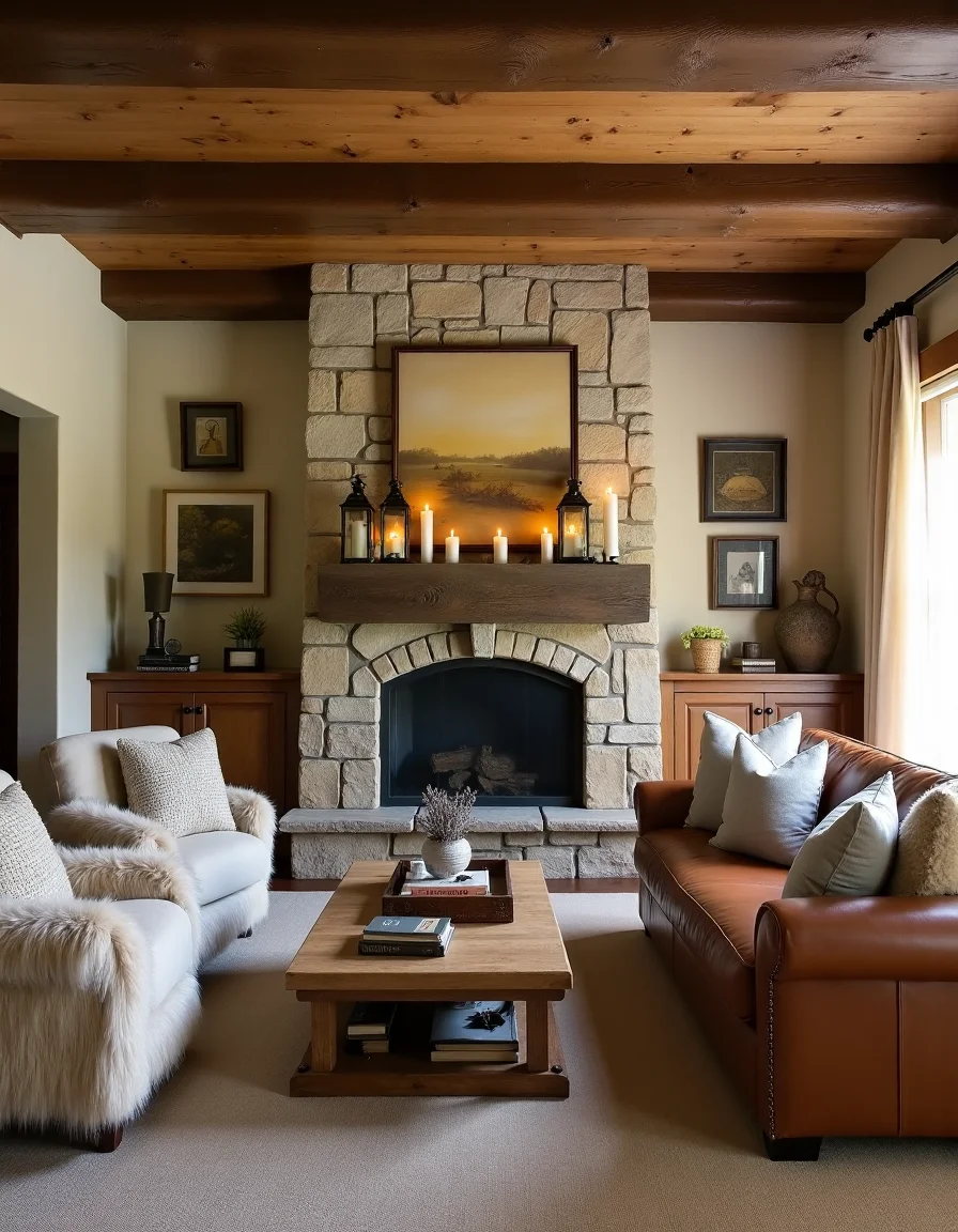 The living room boasts a cozy rustic aesthetic, dominated by warm earth tones, from the deep brown wooden beams overhead to the light beige walls adorned with natural stone accents. A plush taupe area rug anchors the space, while a large, oversized leather couch in distressed chestnut brown is complemented by an array of cream and gray knit throw pillows. Centered against the wall is a majestic stone fireplace decorated with rustic lanterns and a variety of softly glowing candles arranged atop a reclaimed wood mantle, surrounded by a carefully curated selection of rustic wall art featuring nature scenes. In one corner, a vintage wooden coffee table made from reclaimed barn wood hosts a cache of worn novels and a ceramic vase filled with dried lavender, adding a subtle touch of fragrance. Nearby, a pair of fur-lined armchairs invites guests to cozy up with a warm blanket, all illuminated by sunlight filtering through sheer linen curtains that sway gently in the breeze.
