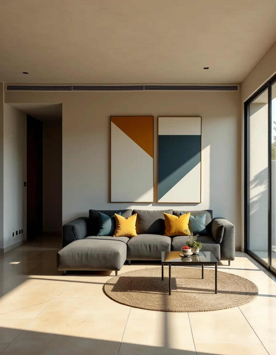 This living room is a stunning embodiment of modern design, featuring sleek clean lines and an open-concept layout that promotes both comfort and style. The walls are clad in a smooth concrete finish, providing a neutral backdrop, while the floor is adorned with large polished stone tiles in a creamy beige hue that reflects natural light beautifully. A minimalist charcoal-gray sectional sofa sits at the heart of the room, accented by geometric-shaped throw pillows in muted tones of mustard and slate blue, enhancing the modern aesthetic without overwhelming it. A low-profile glass coffee table rests atop a simple woven area rug, which adds texture while maintaining harmony with the stone flooring, and large abstract art pieces in bold colors and sharp angles decorate the walls, tying the space together with a dynamic yet sophisticated energy.