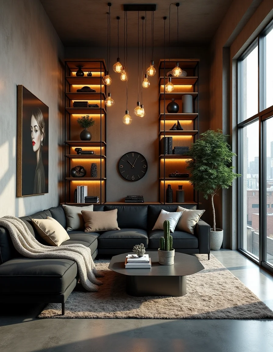 The living room boasts a striking industrial style, with expansive ceiling windows ushering in natural sunlight and offering a panoramic view of the urban landscape. The walls are left exposed with raw concrete finishes, while the floor is made of polished dark gray concrete that adds a sleek touch. A large, charcoal-black sectional sofa forms the centerpiece, adorned with textured, knitted throws and oversized pillows in muted earth tones. An angular metal coffee table sits at the center, topped with a few contemporary art books and a potted cactus. Vintage-style filament bulb fixtures hang from overhead, casting a warm glow across a backdrop of reclaimed wood shelves filled with eclectic decor pieces like metallic sculptures and industrial-style clocks.