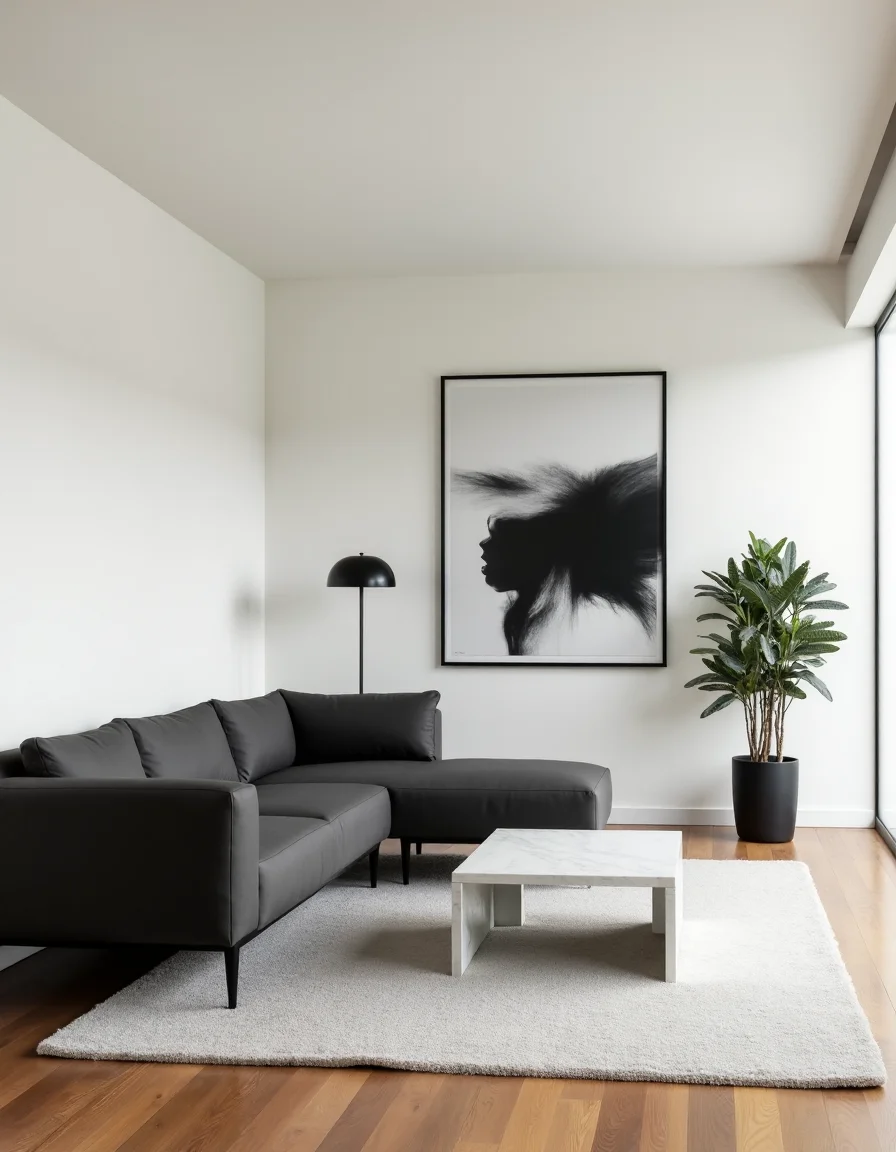 This minimalist living room exudes tranquility with its monochrome color palette of soft whites, charcoals, and muted greys. A low-profile, sectional sofa in sleek charcoal fabric occupies the center, paired with a simple white marble coffee table featuring clean lines and a geometric shape. Adjacent to the sofa, a tall plant in a skinny matte black planter injects a touch of nature into the spacious, uncluttered area. The walls are adorned with a large, abstract black and white painting that draws the eye, while a single, minimalist floor lamp stands gracefully beside it, providing subtle lighting without overwhelming the space. The wooden floor, polished to a soft shine, further enhances the airy ambiance while a plush, light grey area rug defines the seating arrangement without adding visual noise.