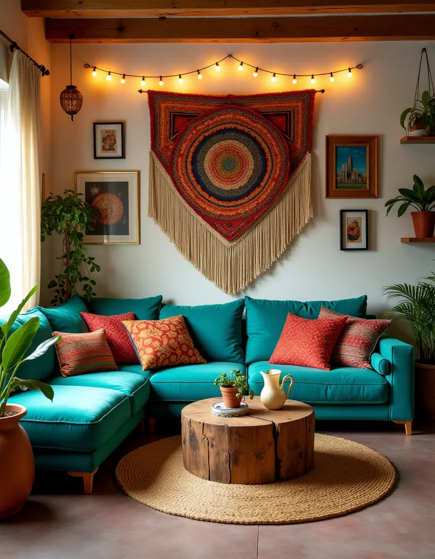 This bohemian living room radiates a cheerful and vibrant ambiance, characterized by an eclectic mix of bold colors and natural textures. A plush, oversized sectional sofa in deep turquoise is adorned with a myriad of patterned throw pillows featuring intricate ethnic prints in warm reds, oranges, and yellows. The walls are decorated with an array of framed paintings and tapestries that showcase colorful abstract art and nature-inspired designs, while a large macramé wall hanging serves as a focal point above a rustic wooden coffee table. A jute area rug adds a soft, natural touch underfoot, and various potted plants in terracotta and ceramic pots bring life and greenery to the space. Vintage brass lanterns and string lights are scattered throughout, creating a cozy, inviting glow that accentuates the room's carefree bohemian spirit.