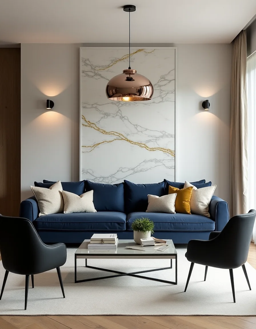 The living room features a striking modern aesthetic, anchored by a sleek marble-feature wall that serves as the focal point behind a plush matte navy sectional sofa, which is L-shaped and adorned with geometric-printed throw pillows in shades of gold and cream. A low-profile rectangular glass coffee table sits at the center, bearing a minimalist arrangement of a small succulent and a stack of contemporary art books. Flanking the coffee table are two matte black accent chairs with slender metal legs, inviting comfortable conversation while adding to the elegance of the space. The room is illuminated by a statement pendant light with a polished chrome finish and a warm pendant glow, complementing the subtle warmth of the light wood flooring that contrasts attractively with the marble elements.