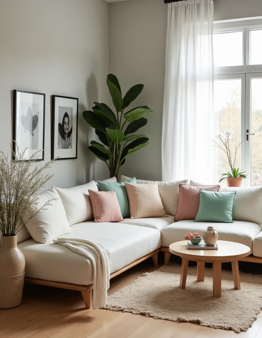 The living room embraces a serene Scandinavian aesthetic, characterized by its light wood furnishings and spacious, airy feel. A plush, off-white sectional sofa sits centrally, adorned with soft, pastel-colored throw pillows in shades of mint and blush. To the left, a minimalist light oak coffee table with clean lines is topped with a ceramic vase displaying fresh eucalyptus and delicate white flowers. A tall, leafy indoor plant thrives in a textured beige pot, positioned near the large floor-to-ceiling window that allows natural light to flood the room. The walls are painted a soft dove gray, complemented by framed black-and-white photographs and a cozy wool area rug in natural tones underfoot, enhancing the harmonious and tranquil ambiance.