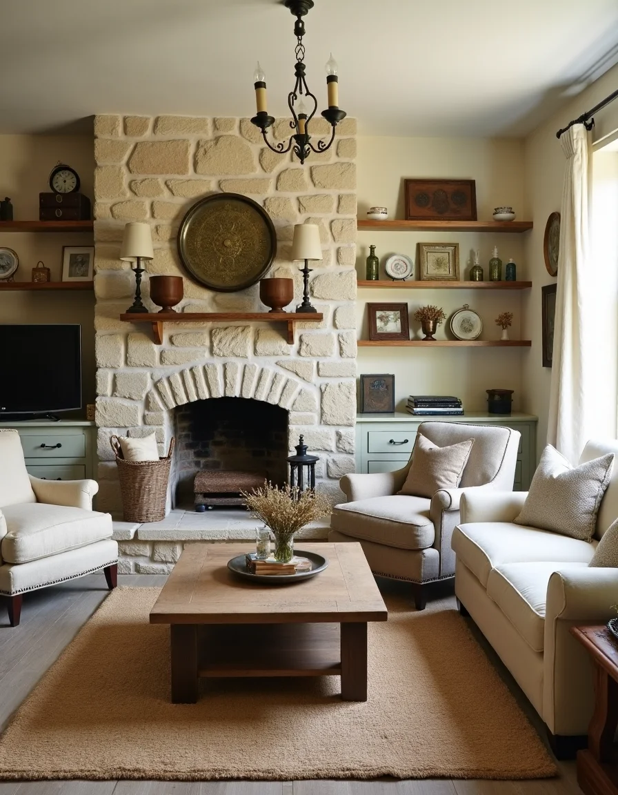 The living room embraces a charming country style, filled with antique furnishings that evoke a sense of nostalgia and warmth. A large, weathered oak coffee table occupies the center, surrounded by mismatched upholstered armchairs in soft neutrals—cream, taupe, and light gray—creating an inviting seating area. The walls are clad in rustic stone, featuring a handmade fireplace adorned with an antique brass fire screen and a few decorative plates hanging above it, while a woven jute rug anchors the space beneath. Shelves lined with vintage books, glass jars with dried wildflowers, and a vintage clock add further charm and character, complemented by a basket of cozy throws tucked into one corner for an additional touch of comfort.