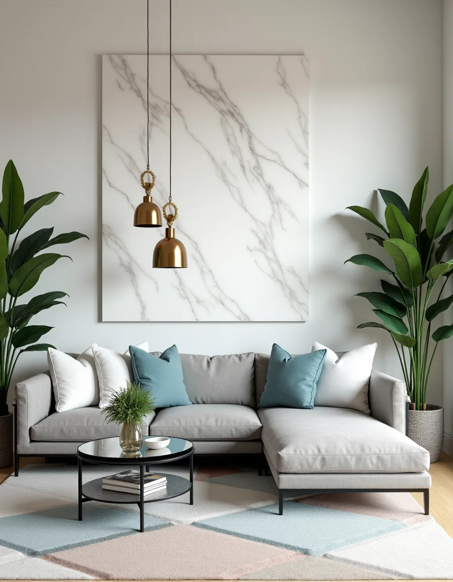 The living room boasts a modern aesthetic accentuated by a sleek white marble feature wall that serves as a stunning backdrop. A low-profile gray sectional sofa, adorned with plush white and muted blue throw pillows, is positioned at the center, inviting relaxation. A minimalist glass coffee table sits atop a large area rug with geometric patterns in soft pastel colors, seamlessly tying the space together. The ambient lighting is enhanced by stylish pendant lights in metallic brass, which hang over the coffee table, creating an elegant focal point. Floor-to-ceiling windows allow natural light to flood in, illuminating the room's clean lines and simple yet sophisticated decor with lush green potted plants strategically placed in the corners for a touch of nature.