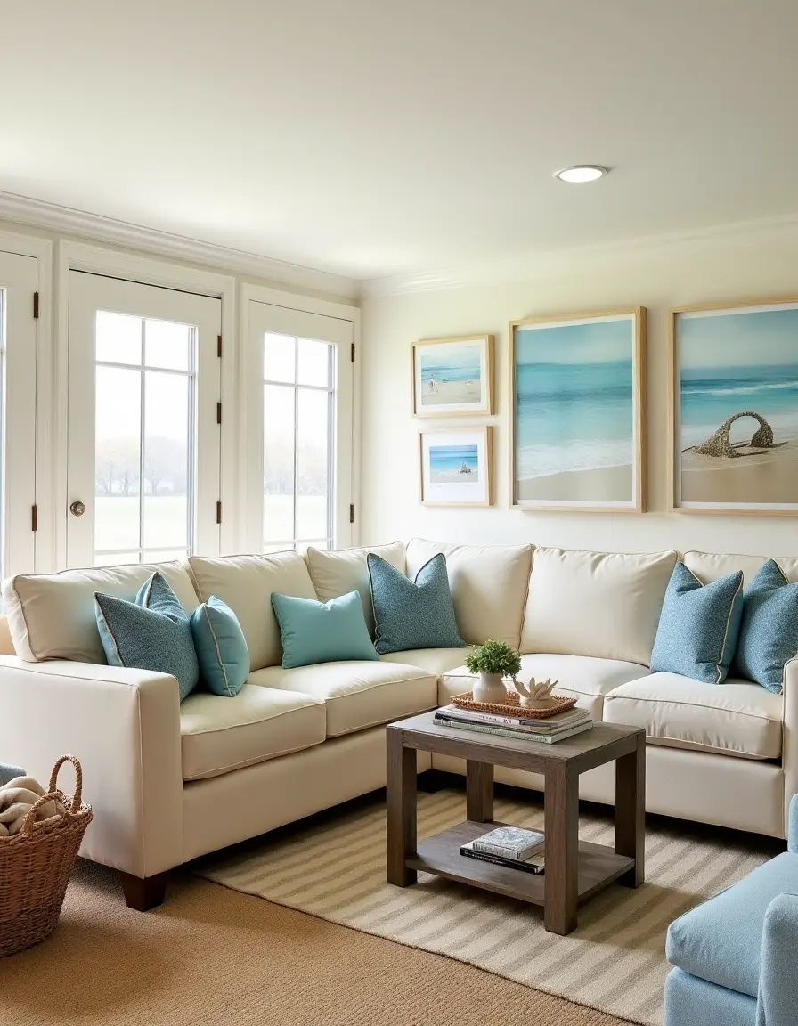The living room embodies a serene seaside aesthetic with soft beige tones dominating the palette, complemented by crisp white accents. Plush, overstuffed sofas in a cream fabric are arranged in a cozy U-shape, accented with blue and turquoise throw pillows that evoke the ocean's colors. A striped jute carpet, adorned with shades of sandy beige and light blue, anchors the seating area and adds texture underfoot. A weathered wooden coffee table sits at the center, featuring a distressed finish that echoes the beach's natural driftwood. Nautical touches, like a large seashell centerpiece and framed coastal photography hung in a staggered design on the walls, bring the essence of the shore indoors, while wicker baskets brim with soft blankets, adding a casual, inviting ambiance to the room.
