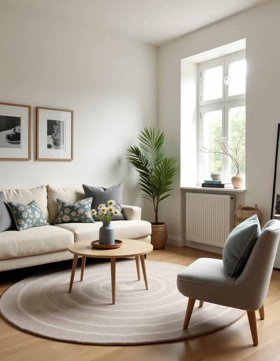 The living room is bright and airy, showcasing a minimalist Scandinavian design that emphasizes functionality and comfort. Pale tones dominate the color palette, with soft whites and light greys for the walls, complemented by a cozy light oak wooden floor that reflects natural light. Centered is a low-profile, beige fabric sofa adorned with floral-patterned throw pillows in muted blues and greens, facing a sleek, light wood coffee table adorned with a simple ceramic vase holding fresh white daisies. In one corner, a stylish armchair in soft grey fabric is paired with a small, circular side table, while a beautifully woven wool area rug in subtle stripes softly defines the seating area and adds warmth. Decorative elements include a large potted plant near a window for a pop of life and minimalistic wall art that features black-and-white prints, together creating a serene, inviting ambiance that's both functional and aesthetically pleasing.
