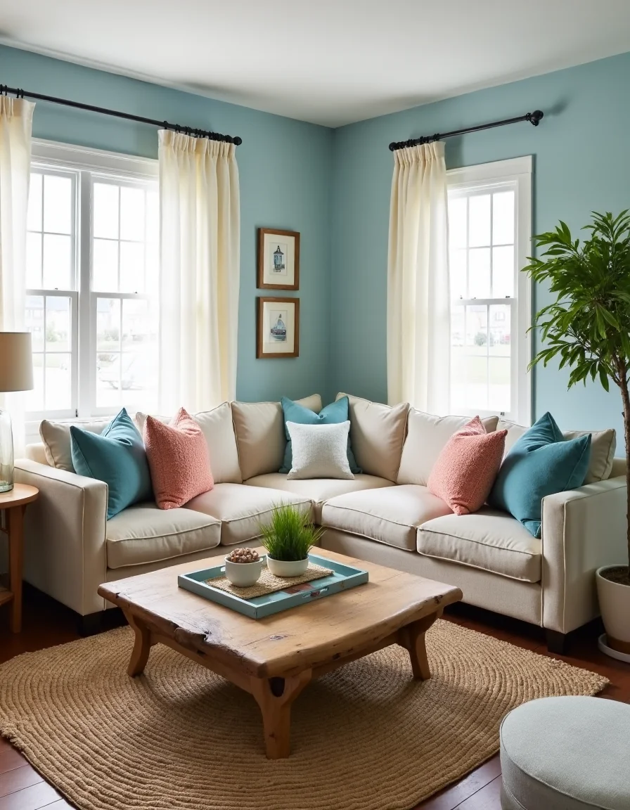 This inviting seaside living room features soft blue walls that evoke the tranquility of the ocean, complemented by crisp white trim. A large, plush sectional sofa in a sandy beige is centered against the wall, adorned with an array of throw pillows in shades of aqua, coral, and light gray for a coastal touch. In front of the sofa, a rustic reclaimed wood coffee table holds a curated collection of seashells and a small potted succulent, while a woven jute area rug grounds the space and adds textural interest. Flanking the windows, sheer linen curtains billow gently in the breeze, allowing natural light to flood the room, while framed nautical-themed art hung asymmetrically adds a personal touch. A corner side table with a thick glass lamp provides warm lighting, enhancing the room's serene ambiance, and a large indoor plant in a ceramic pot breathes life into the space.