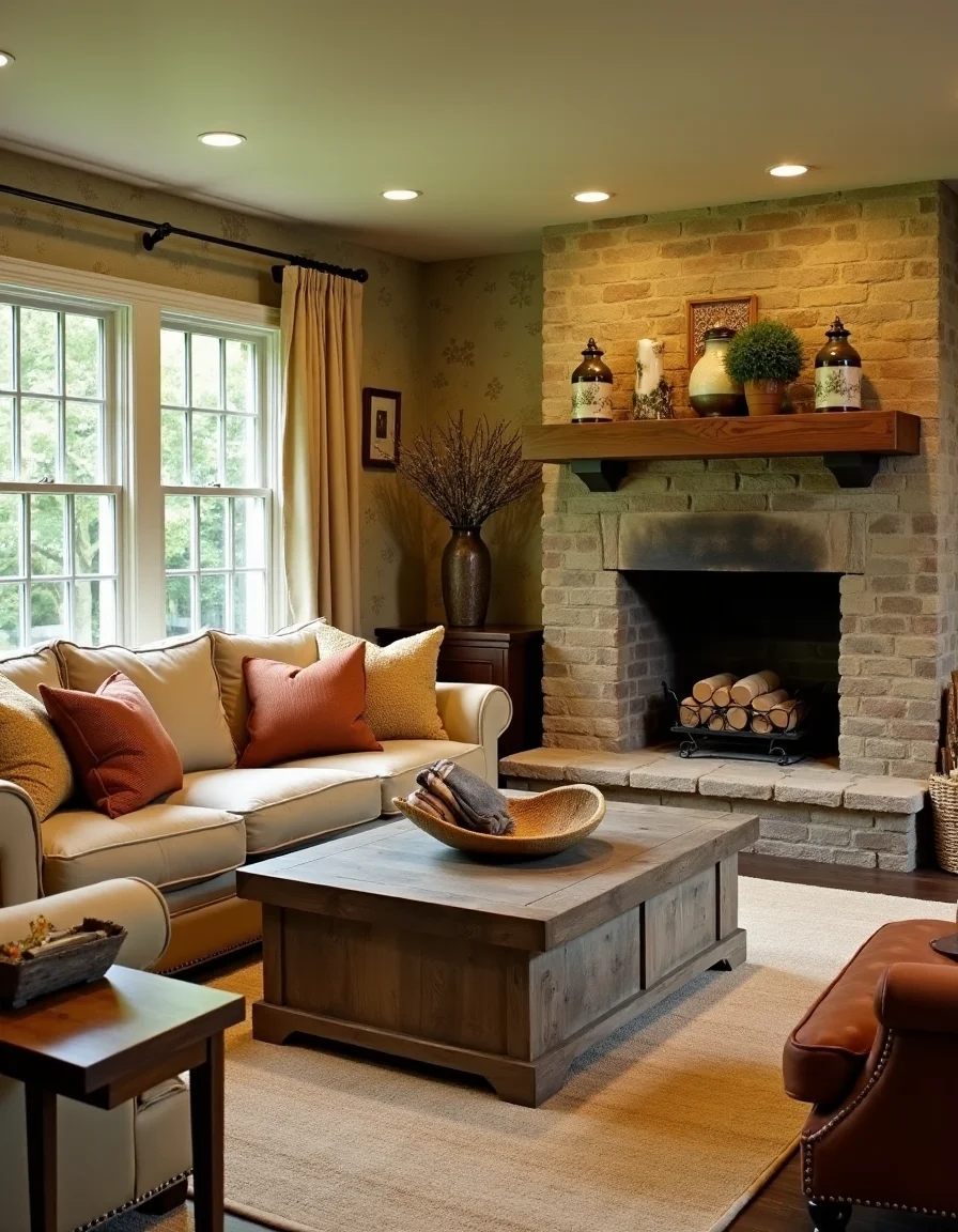 This cozy country living room exudes warmth and comfort, featuring beige and soft olive green walls adorned with vintage floral wallpaper in a muted color palette. A large, inviting L-shaped sofa in soft tan linen sits centrally, layered with various textured throw pillows in earthy tones of ochre, rust, and cream. A sturdy reclaimed wooden coffee table with a distressed finish occupies the center, while rustic stone accents surround a traditional brick fireplace, complete with a solid wood mantel dotted with potted herbs and handcrafted pottery. Woven baskets filled with blankets and a set of hand-painted country-style vases on a nearby side table enhance the inviting vibe, alongside a soft, beige shag rug that anchors the space, all under warm ambient lighting that casts a gentle glow throughout.