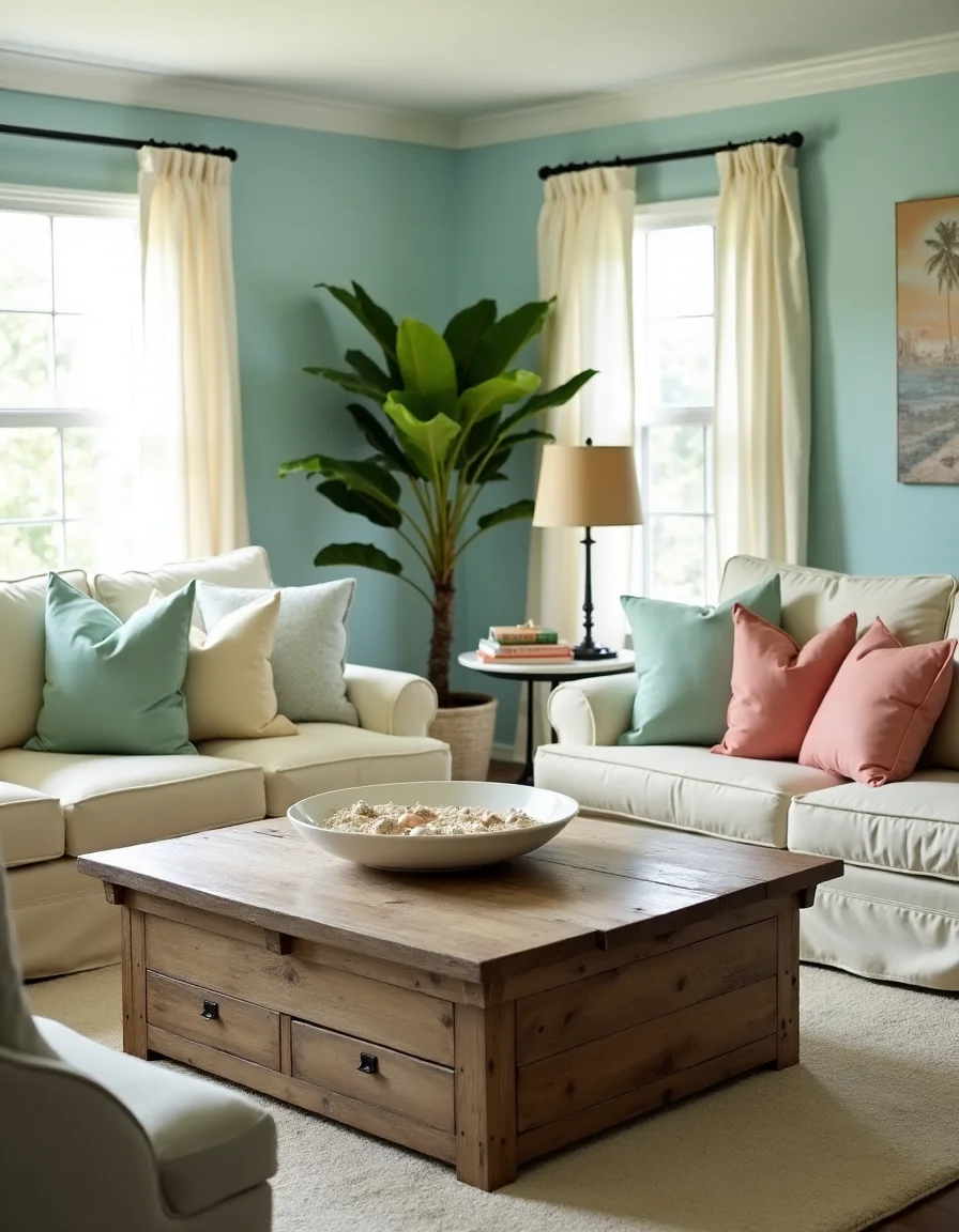 The living room embraces a serene seaside theme, featuring plush, cream-colored sofas adorned with seafoam green and soft coral throw pillows that instantly evoke the ocean's tranquility. A large, weathered wooden coffee table, reminiscent of driftwood, sits center-stage, adorned with a white ceramic bowl filled with sand and seashells, reinforcing the beach vibe. The walls are painted a calming light blue, while sheer curtains flutter gently in the coastal breeze, allowing soft natural light to fill the space. In one corner, a cozy reading nook is created with a light gray armchair and a small white side table, surrounded by house plants that infuse the room with life, providing a natural flow that reflects the beachfront ambiance.