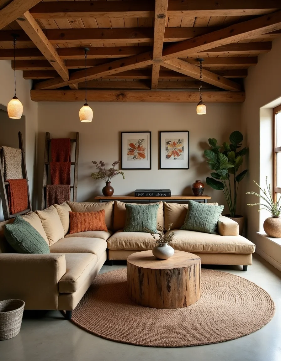 The living room exudes a warm, rustic charm, featuring exposed wooden beams that crisscross the ceiling and reclaimed barn wood paneling on the walls. A large, plush sectional sofa in earthy taupe is arranged at the center, adorned with handmade knitted throw pillows in muted greens and terracotta hues, inviting relaxation. A sturdy coffee table crafted from a weathered oak slab sits atop a woven jute rug, while artisanal ceramic pots filled with wildflowers dot the space. A vintage ladder propped against one wall showcases colorful woven blankets and artisanal crafts, while softly glowing lanterns suspended from the ceiling provide ambient light, emphasizing the raw and natural elements throughout.