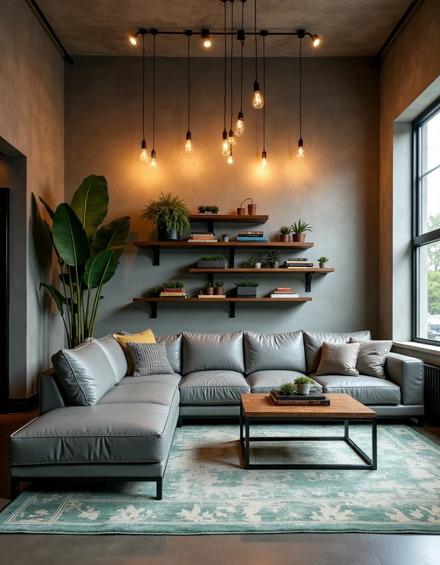 The living room boasts a striking industrial aesthetic, featuring raw concrete walls that provide a stark backdrop for the space. A large sectional sofa is upholstered in distressed gray leather, positioned in an L-shape to create a cozy conversational area. Opposite the sofa, an iron coffee table with a reclaimed wood top adds warmth and texture, while above, exposed Edison bulb light fixtures hang from a high ceiling, illuminating the room with a warm glow. The room is adorned with iron shelves laden with potted succulents and vintage books, adding a touch of greenery among the metal and stone elements. A distressed Persian rug in shades of teal and cream anchors the seating area, providing visual contrast and inviting comfort amidst the industrial vibe.