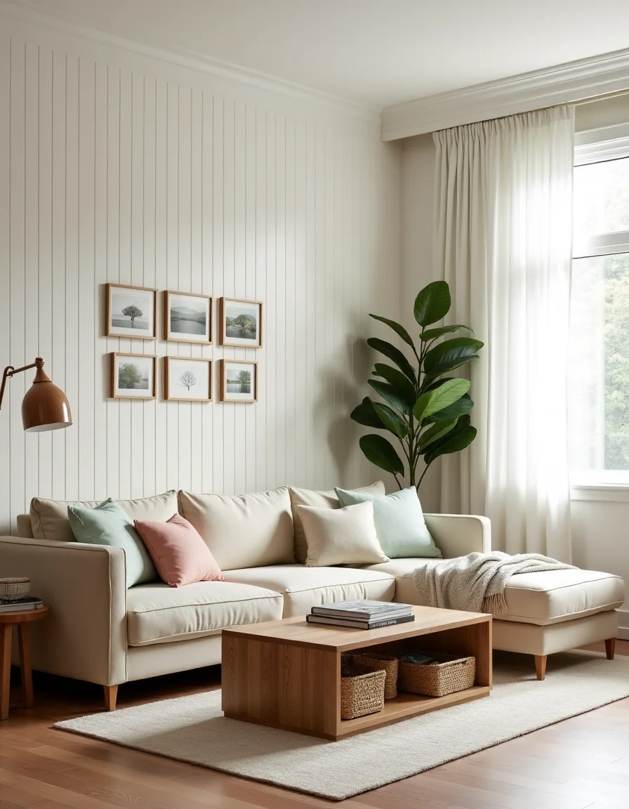 This Scandinavian-inspired living room is a cozy haven filled with natural materials and pale tones that evoke a sense of warmth and simplicity. The walls are painted a soft off-white, allowing the light to bounce off the subtle texture of the wood paneling. A large, plush beige sectional sofa occupies the center, adorned with several cushions in muted pastel colors like light mint and blush. In front of the sofa sits a minimalist coffee table made from reclaimed oak, paired with woven storage baskets that neatly store magazines and throws. Hanging above, a collection of framed nature photographs in thin wooden frames adds a touch of personality, while a minimalistic floor lamp with a light wood finish provides ambient lighting near a lush potted fern positioned next to a large window draped with sheer white curtains, filtering soft daylight into the room.